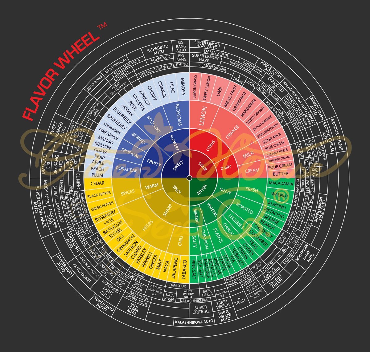 У гринов же давным давно была таблица..На официальном сайте Green House Seed Company есть страница с интерактивной или печатной версией их фирменного “Flavour Wheel” (карта ароматов) с привязками по сорту, если что...